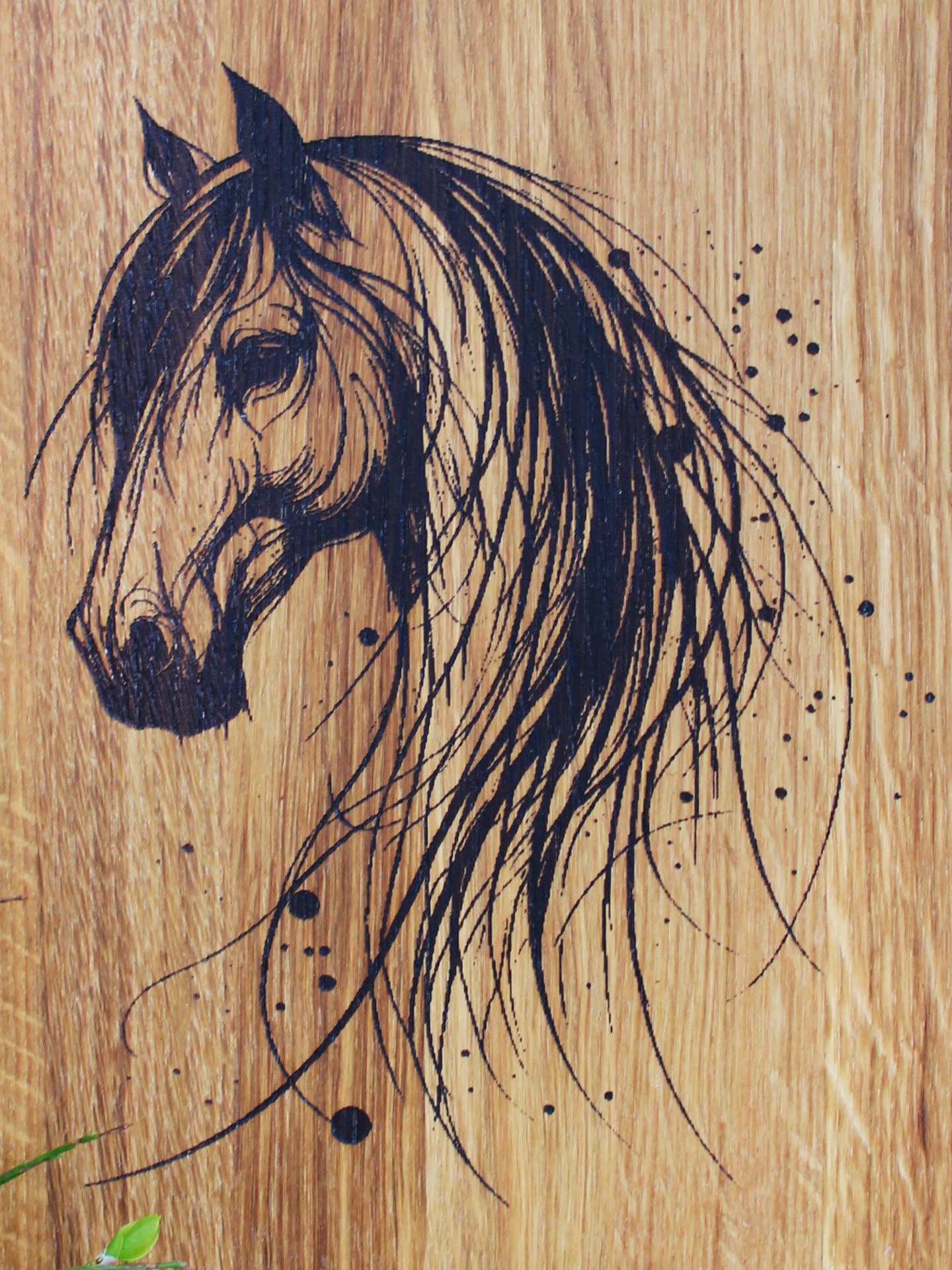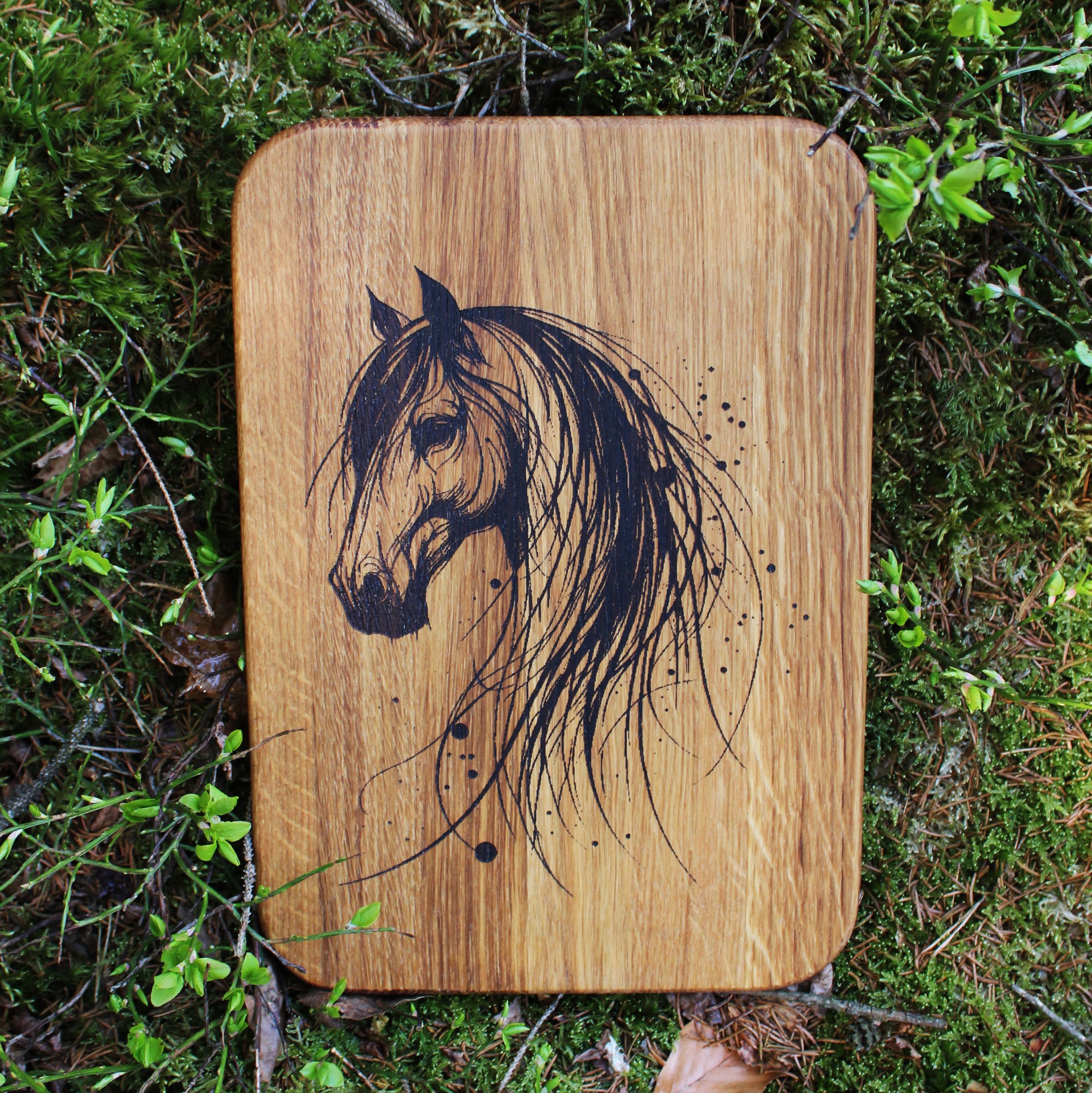 Dekorativní dubové prkénko s motivem koně vhodné na krájení nebo servírování. Povrch je ošetřený směsí olejů a včelího vosku vhodných pro styk s potravinami.