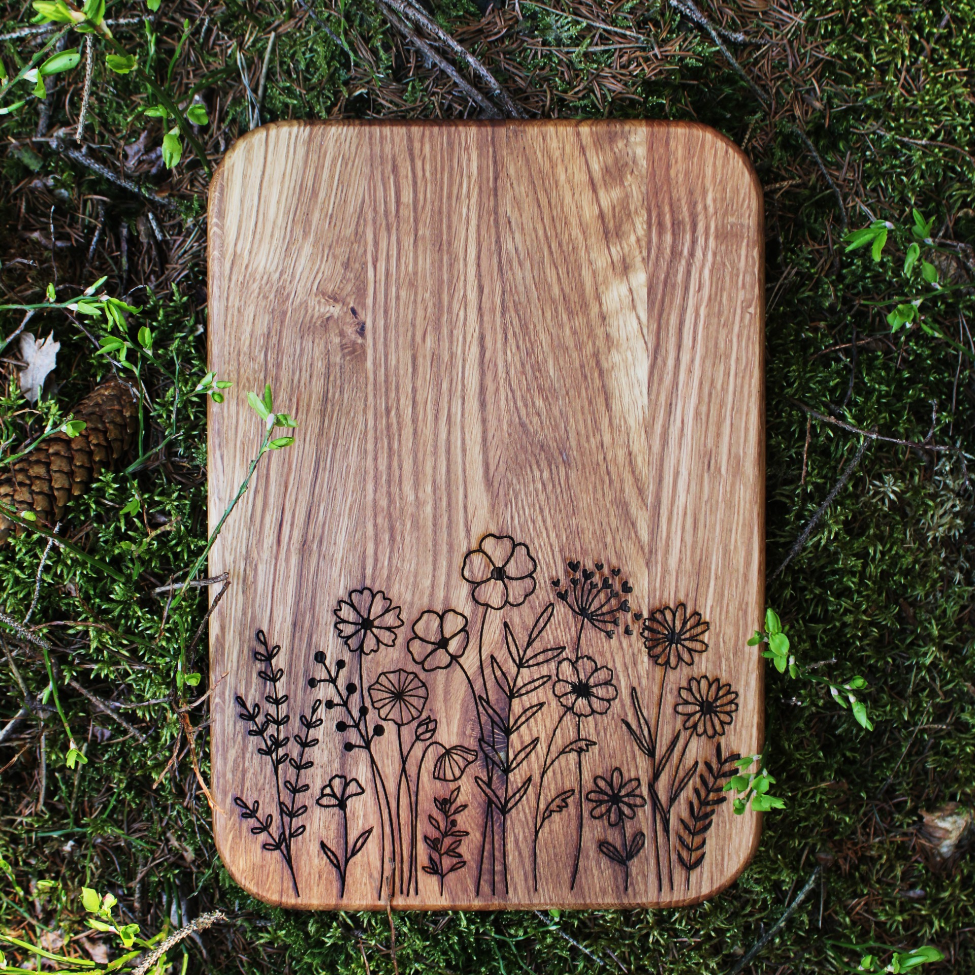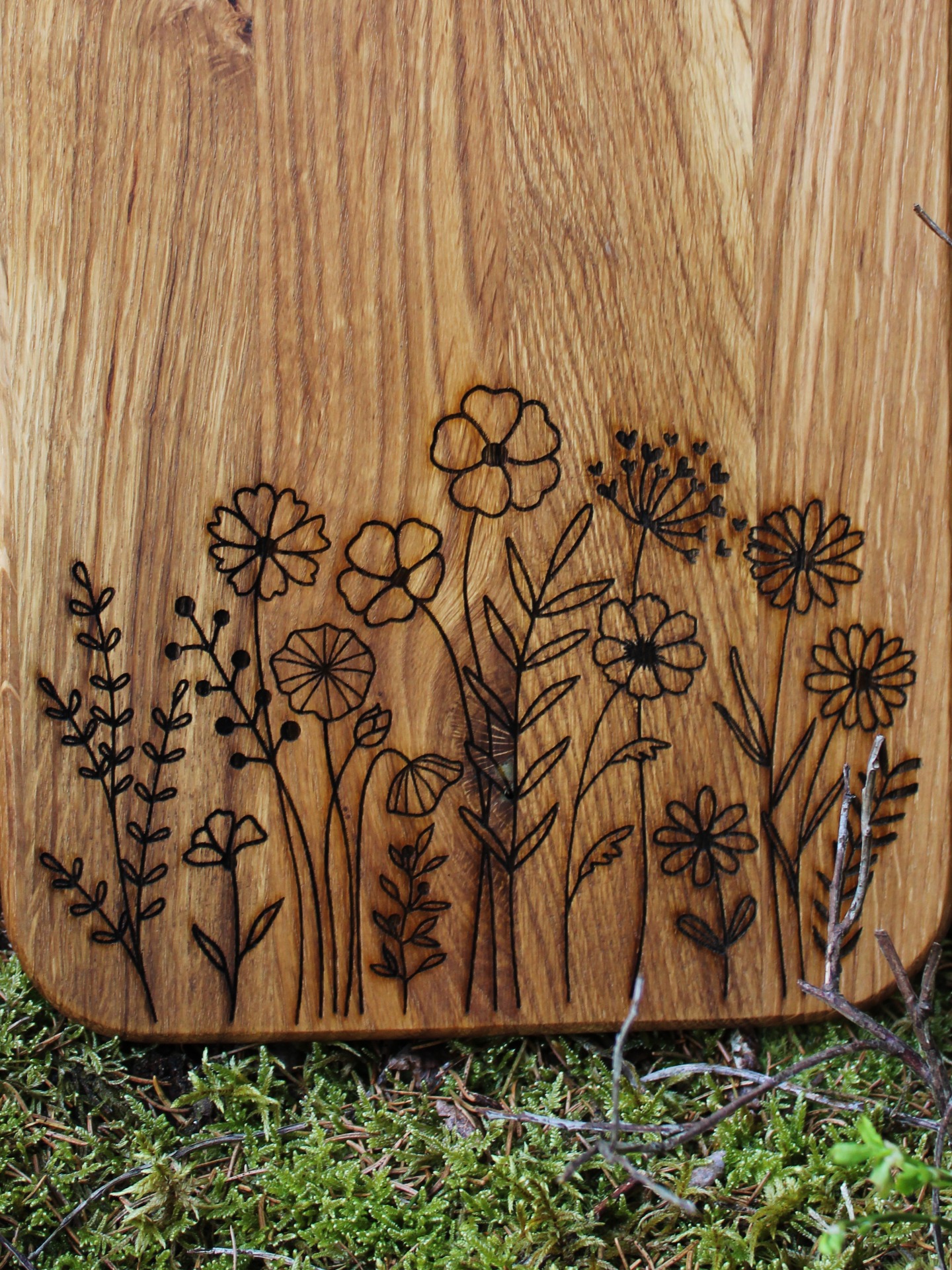 Nechce svou kuchyni rozkvést. Dekorativní dubové prkénko s květinovou loukou. Je vhodné na krájení nebo servírování. Povrch je ošetřený směsí olejů a včelího vosku vhodných pro styk s potravinami.