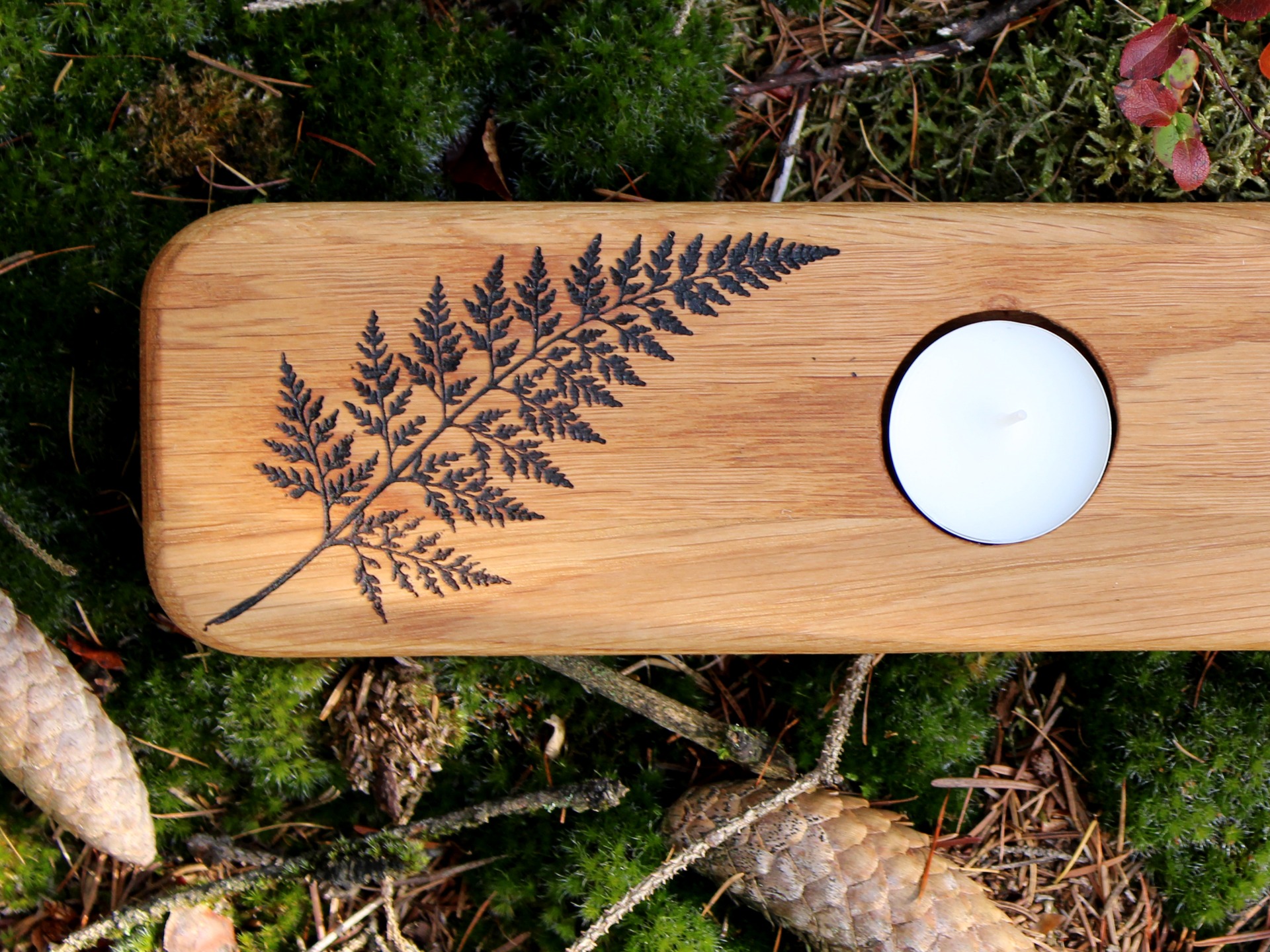 Dřevěný svícen na tři čajové svíčky. Povrch je ošetřený směsí olejů a včelího vosku.
