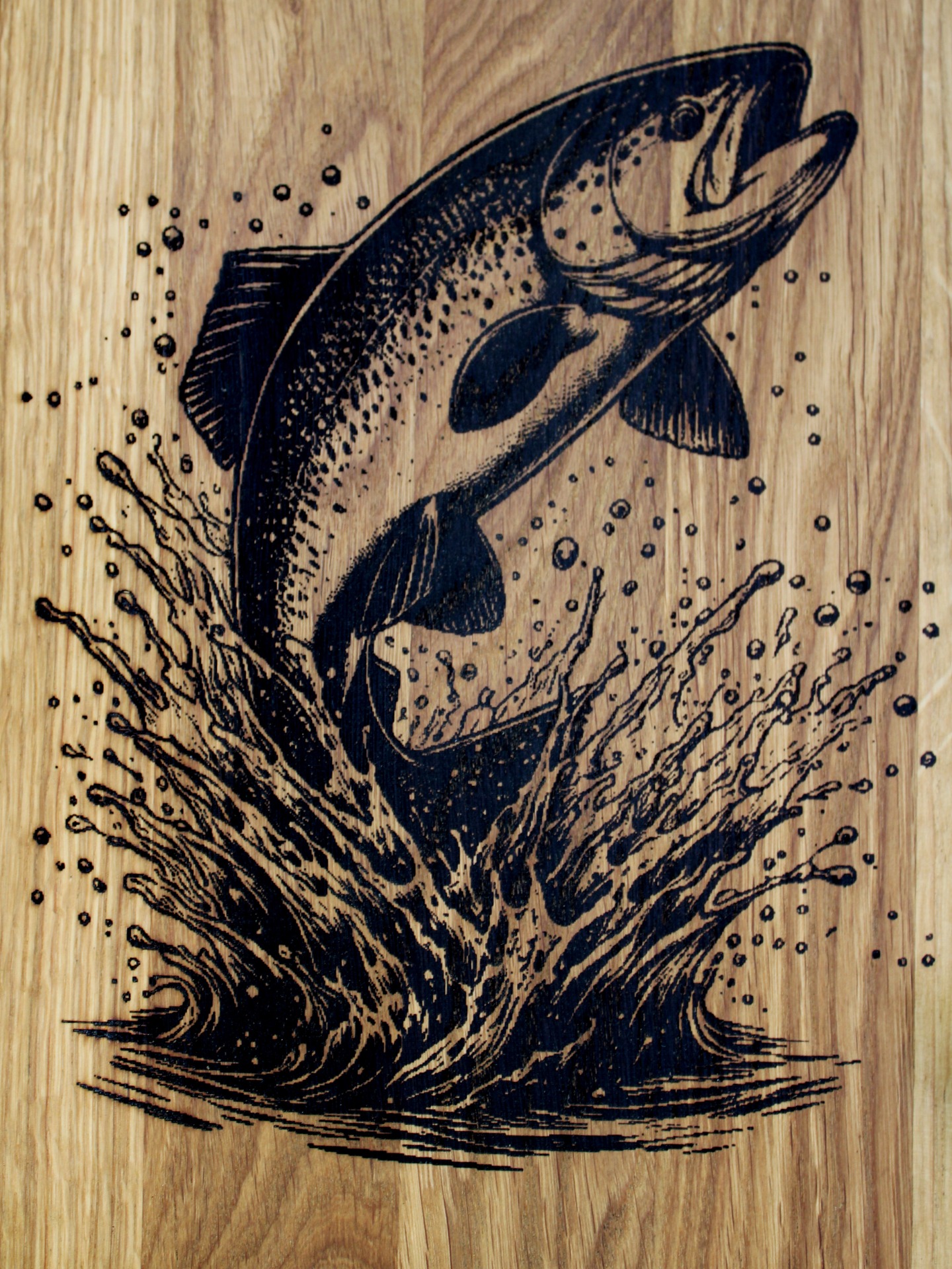 Masivní dubové prkénko, které potěší každého rybáře. Dekorativní prkénko vhodné na krájení nebo servírování. Povrch je ošetřený směsí olejů a včelího vosku vhodných pro styk s potravinami. Na prkénko lze po domluvě vypálit i jméno či věnování.